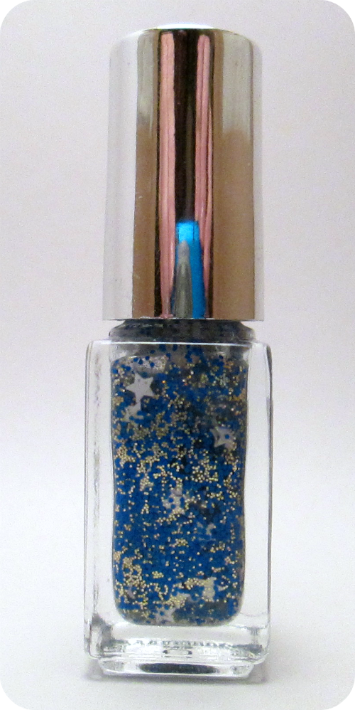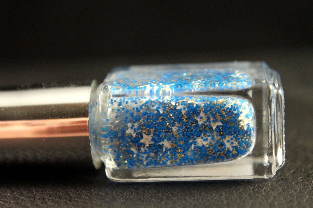 White stars with small blue matte hex and flecks of gold holo